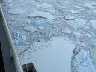 We started the day with every intention to go ashore to visit an abandoned British station that was supposed to be interesting. As the fog began to lift in the late morning , we were able to see an ice field where we slowly motored through huge icebergs and flat sea ice with an occasional penguin or sea lion on top. This ship is built to go through ice. Being out on deck gives the visual and auditory experience of the ice. It is magical.