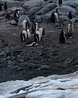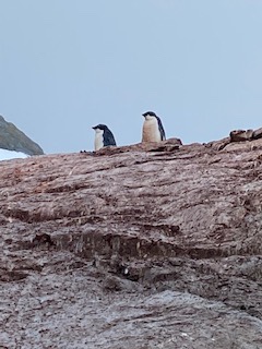 In the afternoon we arrived at Peterman island where the French explorer Charcot spent several winters with his crew intentionally iced in on his boat “pourquoi pas” (why not). PP is etched in one of the rocks near his landing site. On land we saw Adélie penguins along with Gentoos. They are about the same size as Gentoos but their heads are completely black. There was a group of young Adélie penguins wandering about….seen in my video.