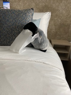 I am posting a few photos showing our captain, navigator and expedition leader, and then the very inventive things that our chambermaid has done with the stuffed toys we had bought for gifts….very amusing every night.