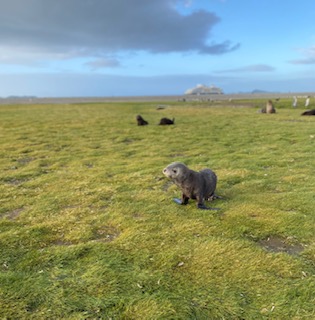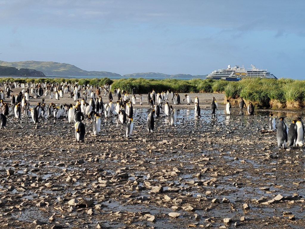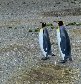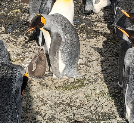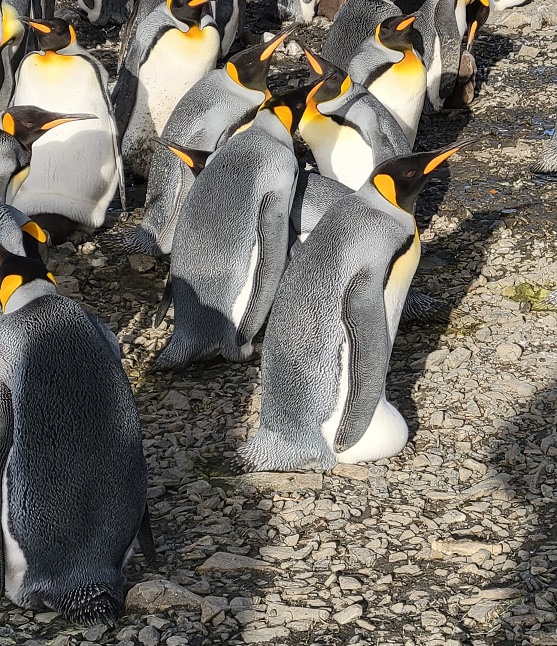 Finally once the transfer was complete, we went to a harbor in Salisbury plain where we were told we would have a land based late afternoon trip. We were not very enthusiastic but we decided to go anyway. Wow. It was a super treat. There was an enormous colony of king penguins in all stages of development. There were eggs, chicks, and year old young ones who were just beginning to molt. They are very curious as we walk nearby and they look spectacular. There were also lots of baby fur seals. The afternoon light made the photos even better. Everyone was excited.