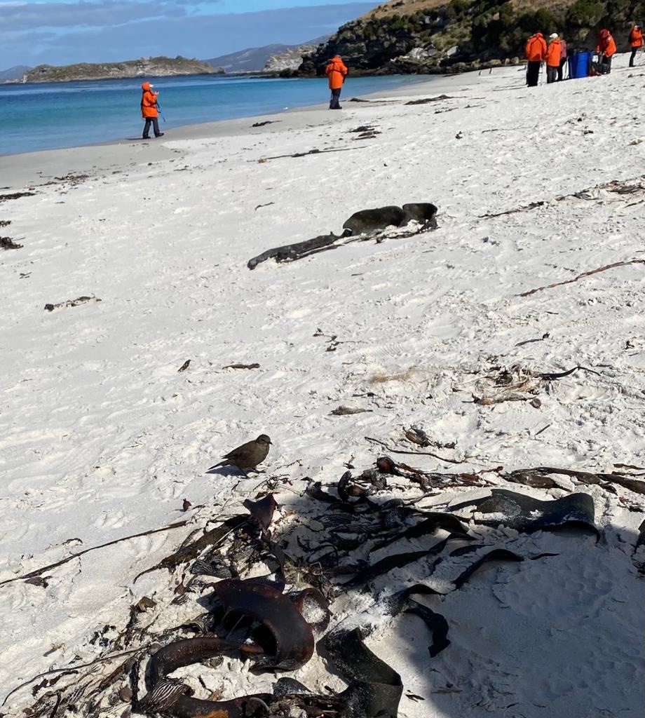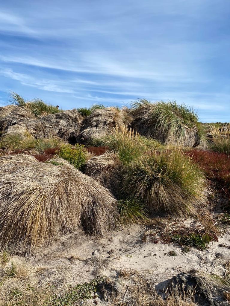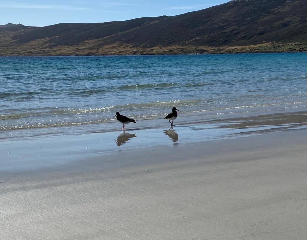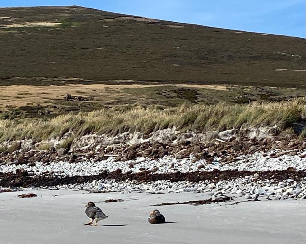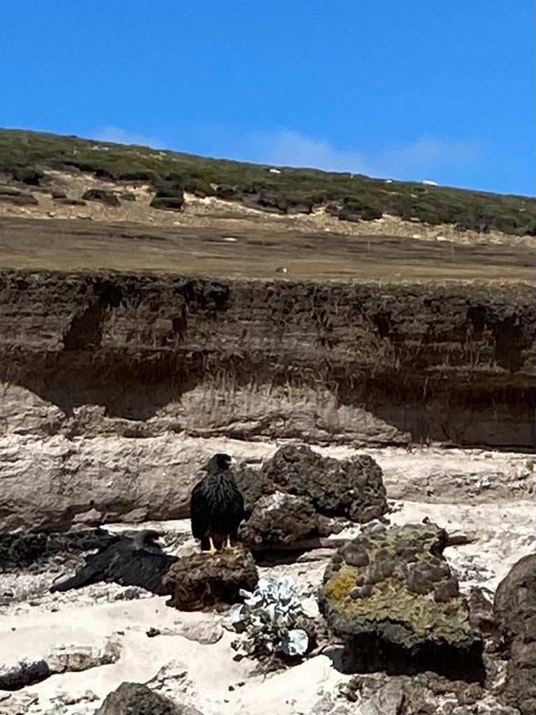 There were many tiny inquisitive dark birds, tussock birds, on the beach. Large dark Cara cara birds with sharp beaks sat on rocks and grass hillocks along the edge of the beach.