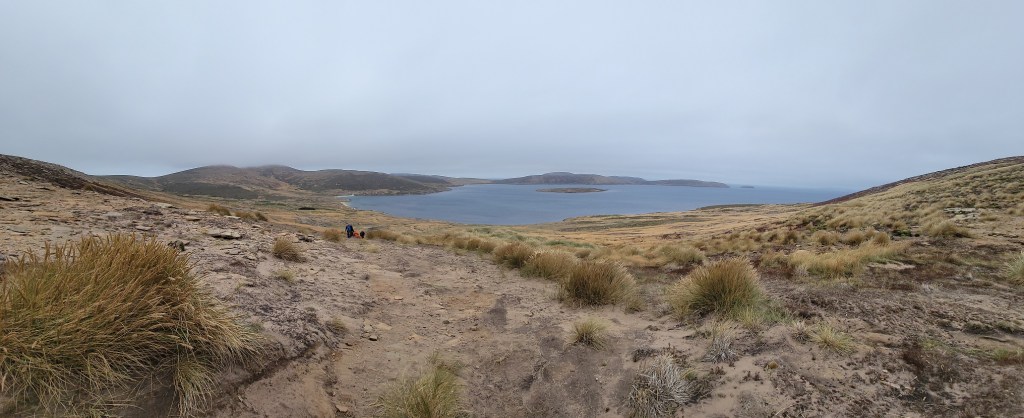 Our afternoon adventure was a 5 mile hike across a big stretch of the island. We were told that after we were dropped off, the ship would move to another cove to meet us. As we came above the first ridge we saw the ship moving along. It looked at first like we might have a fairly short hike, but then the ship disappeared around to a different bay. It was a long hilly trip. We encountered a truck that was traveling slowly across some rugged road ruts. There was even one road sign. Road repair was done with local rocks. As we finally descended, we crossed a peat bog that was spongy and difficult walking. The boat and RIBS were a welcome sight. These areas are very unspoiled and remote. They are well suited to the many birds that inhabit the rocks, cliffs and burrows.