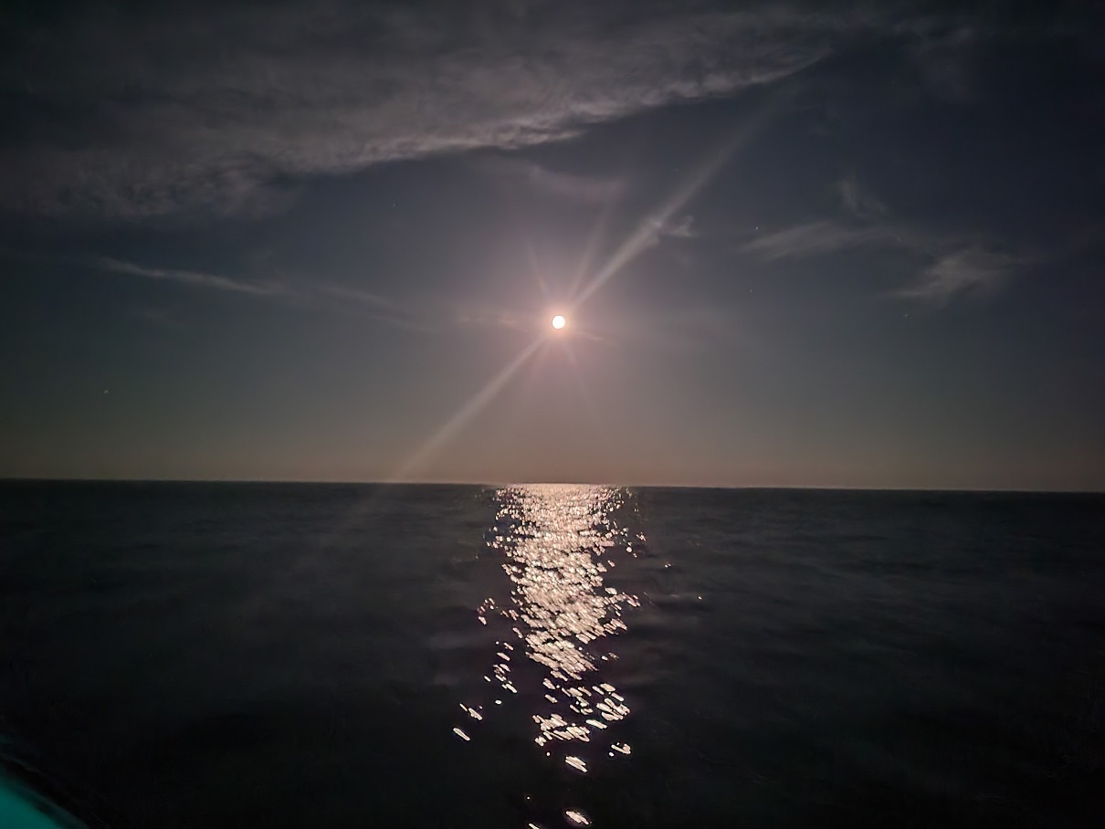 Nancy and I were on watch as the full moon rose as an orange slit in the sky. We first discussed that it might be a brightly lit ship but it became apparent that it was the moon rising through a string of low clouds. No photo can really show the beauty of full moon rise at