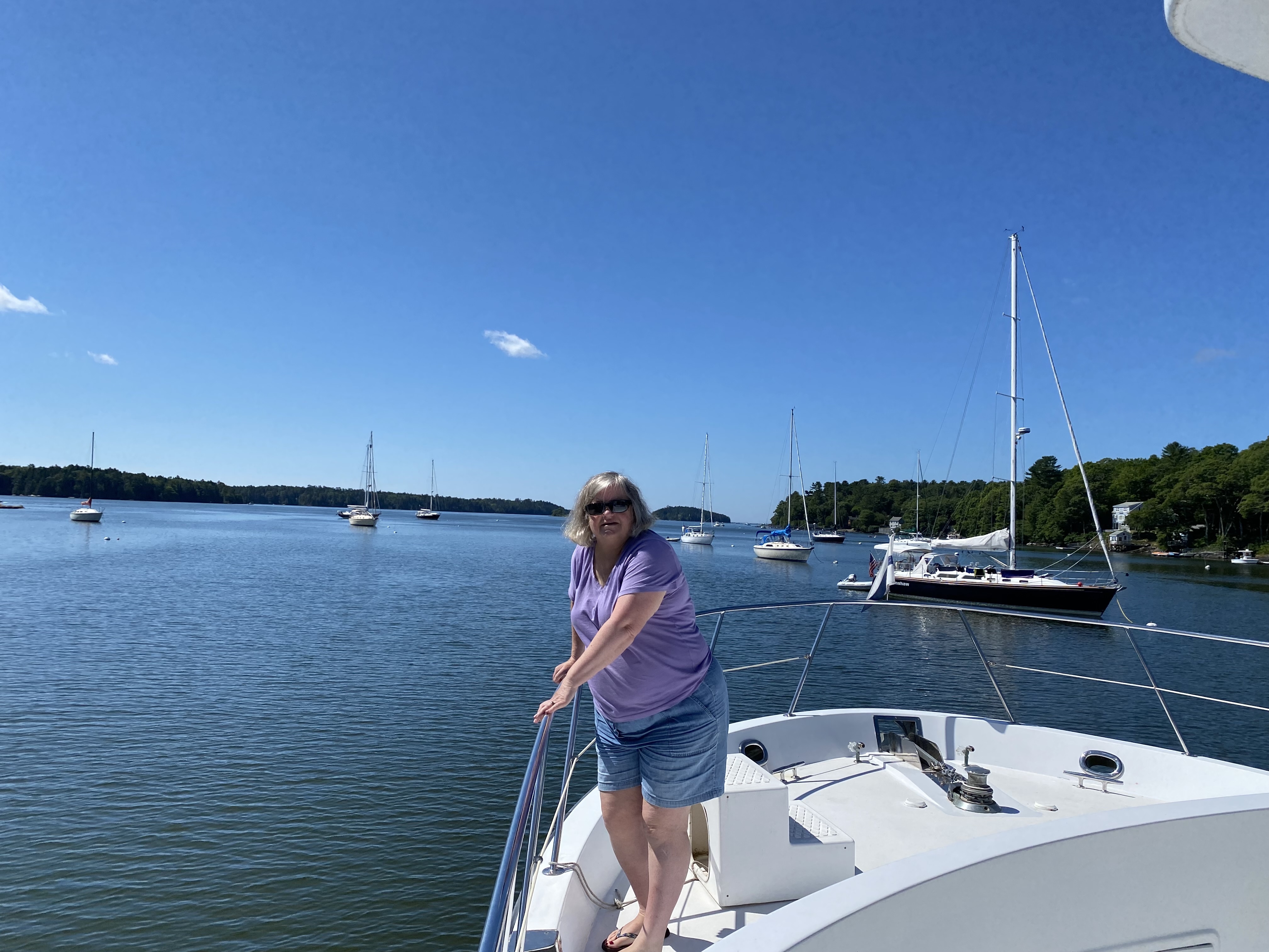 Leaving Harpswell. Bev is stowing lines and