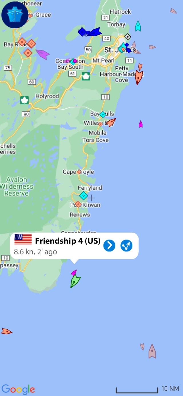 18 July 2022 – Monday – Update on Passage to St. John’s, Newfoundland Sent from my MarineTraffic app for iOS FRIENDSHIP 4 position at 642pm NDT Share this: Share on X (Opens in new window) X Share on Facebook (Opens in new window) Facebook Like Loading... Related