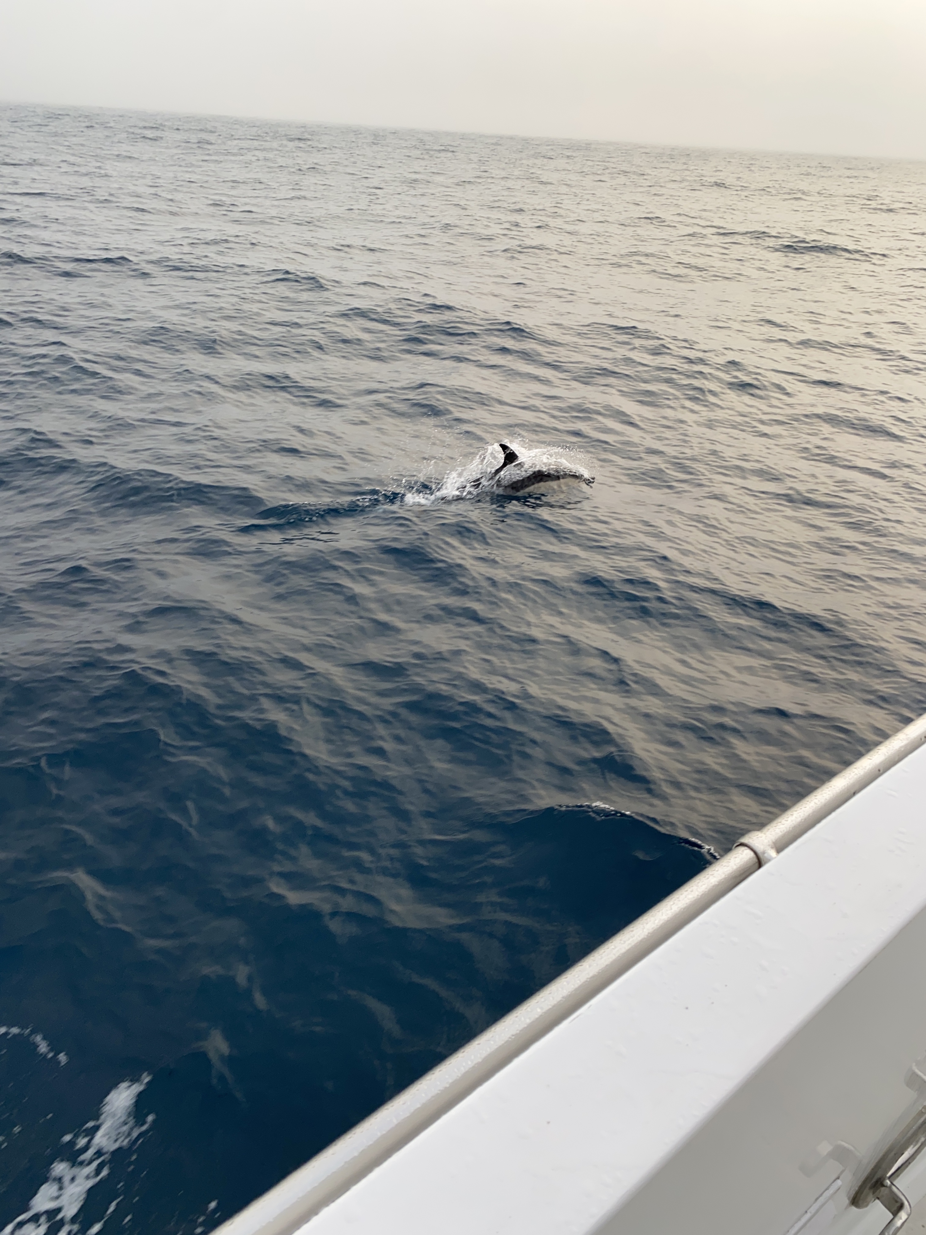 It was sunny most of the day and we were joined by several packs of dolphins playing in our bow wake. One is seen in the photo.