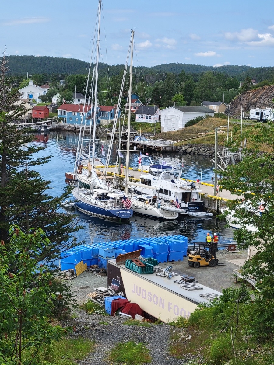 We motored across Bonavista bay to Barrows harbor on Monday and tucked into a tiny beautiful spot called smoky hole. Our Newfoundland friends know places we would never find. We anchored in about 30 feet of water and tied up with Moya, the commodore of the Royal Newfoundland yacht club. Since we had a relaxed slow passage, it was cocktail hour by the time we got settled. We had a fun evening with lamb ragu pasta and a game or 2 of Rummikub.
