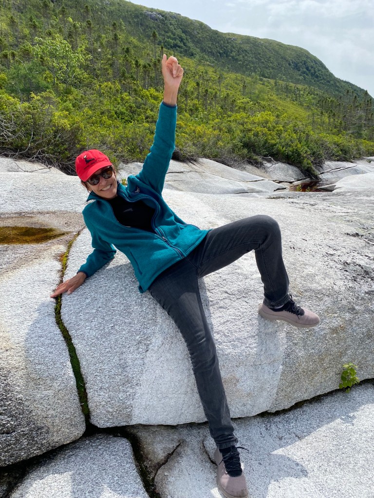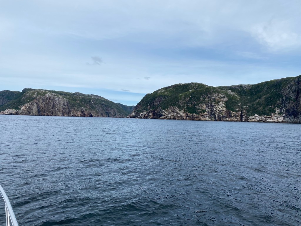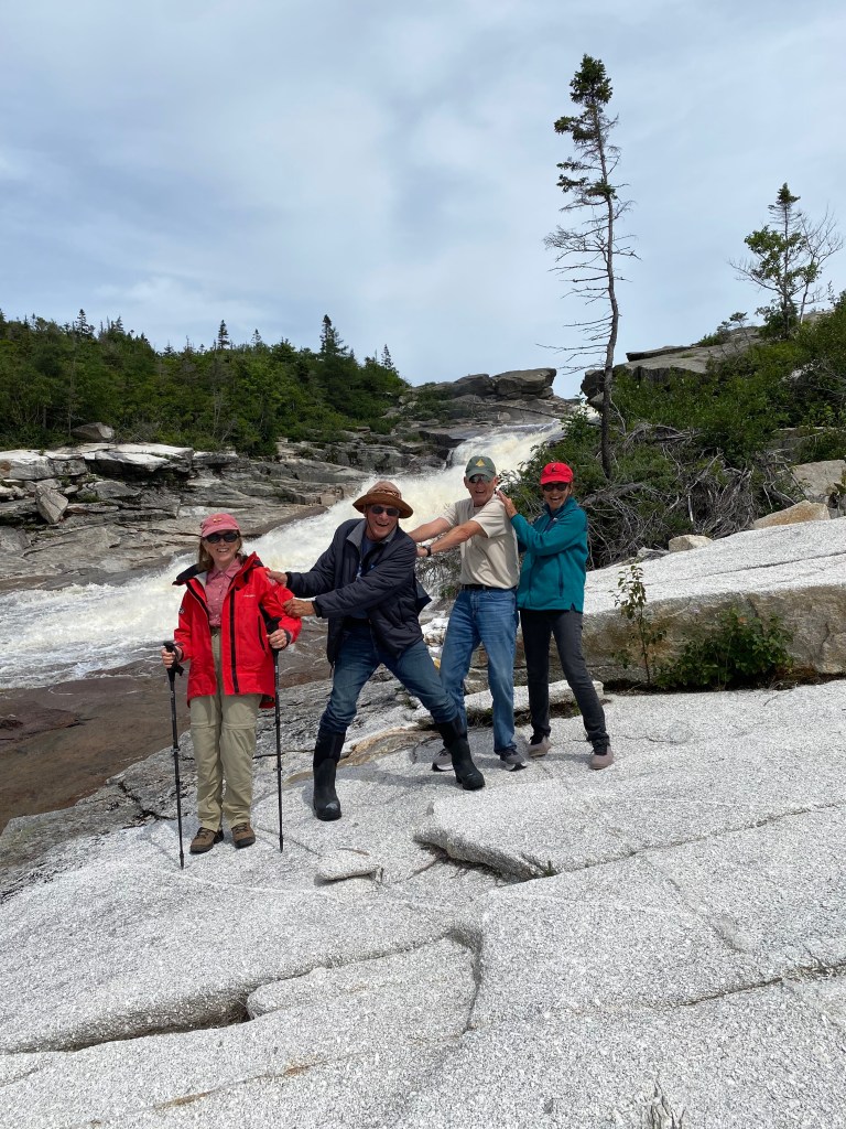 I had been to Hare bay before in 2017. I remembered it as one of the very spectacular places to stop. The hidden entrance opens into a long cliff lined passage with multiple waterfalls and rock faces dotted with pines. We made our way up the fjord to anchor in the northwest arm behind sandy point. After a quick lunch, we planned a dinghy ride to climb the Morgan brook waterfalls on the other arm of the water. There we could hike up along an enormous waterfall. We found a good flat rock to use for landing and tied up on a few trees. We made our way along the water’s edge to the side of the waterfalls that was not wet but clearly was a path for water when there was more flow. The rocks were surprisingly easy to scale because they were rough granite. We climbed to a ridge stopping for photos along the way. Nancy, Maggie and I stopped just before the feeding river at the top because the path was difficult. Mark and Charlie went a bit further. The amount of water pouring out was noisy and impressive. As we began to drop back down, the black flies started torturing us. The look like tiny gnats but they bite and leave big itchy bumps!!! The photos can’t really give you a sense of the panorama and roar of the water but I took them to try to show the beauty.