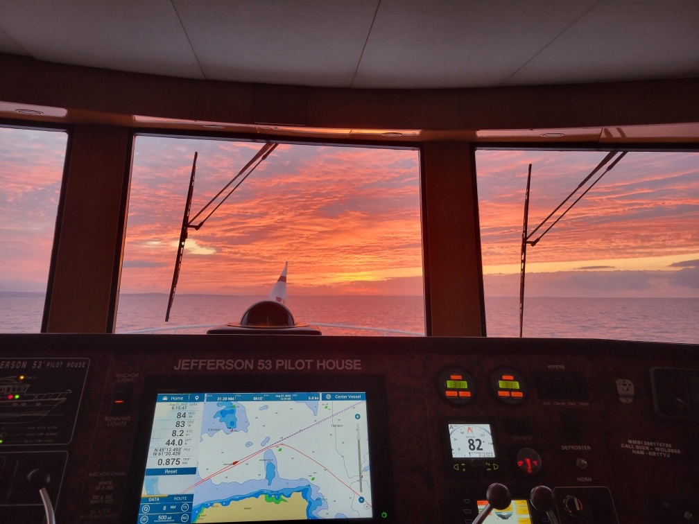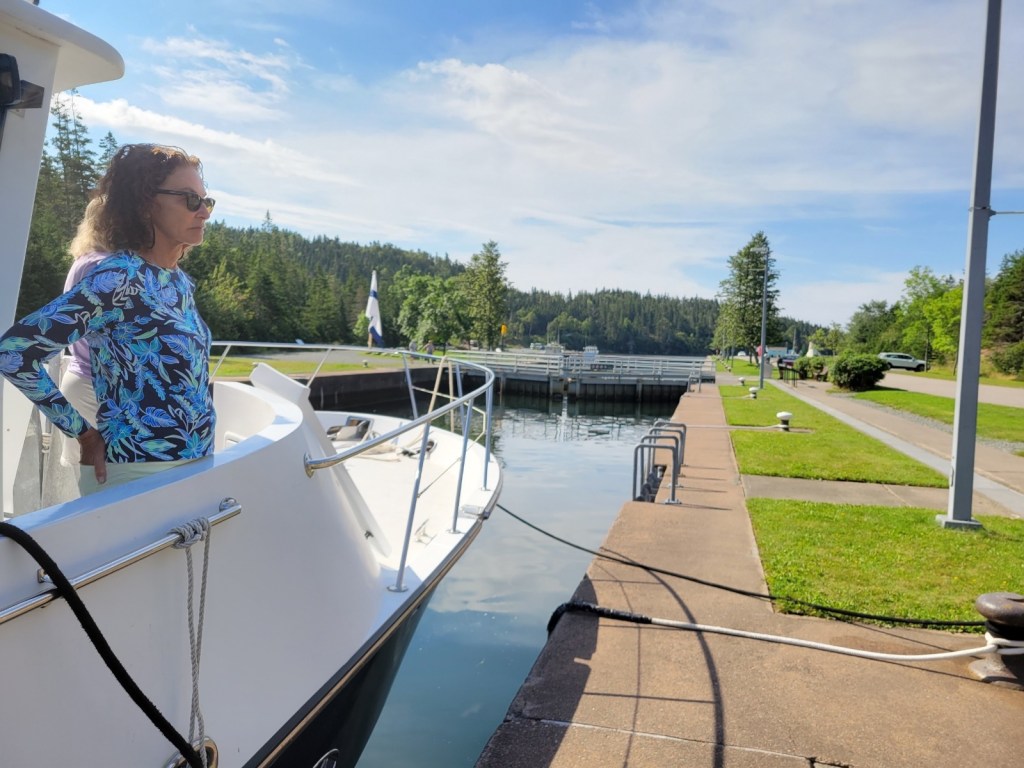 The canal and lock exiting St. Peter’s and the Bras D’Or lakes is a small operation. We radioed the bridge operator asking for the bridge to open. The bridge operator then arrived by truck a few minutes later to swing the bridge. We were told that the lock was open on our side so we could proceed into the lock. We tied up along the lock wall and waited for the lock operator to arrive. After several minutes, 2 women in uniforms arrived to operate the locks. They closed the lock behind us, opened the doors ahead and we were off.