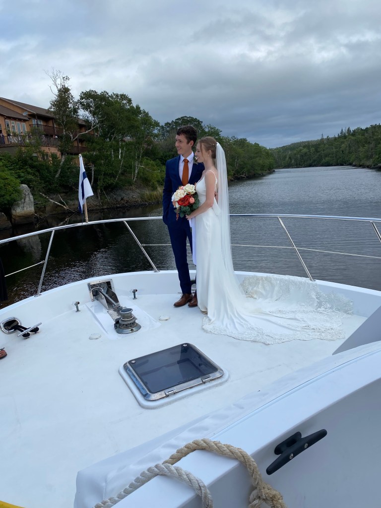 Maggie and I took the opportunity for a land based shower. We had poked around the lodge a bit and found that there was a wedding taking place in the evening. After we returned to the boat, the bride and groom were coming to the dock for photos. Mark offered to have them on the boat for a photo. So they climbed on board and had a few photos taken on the bow.