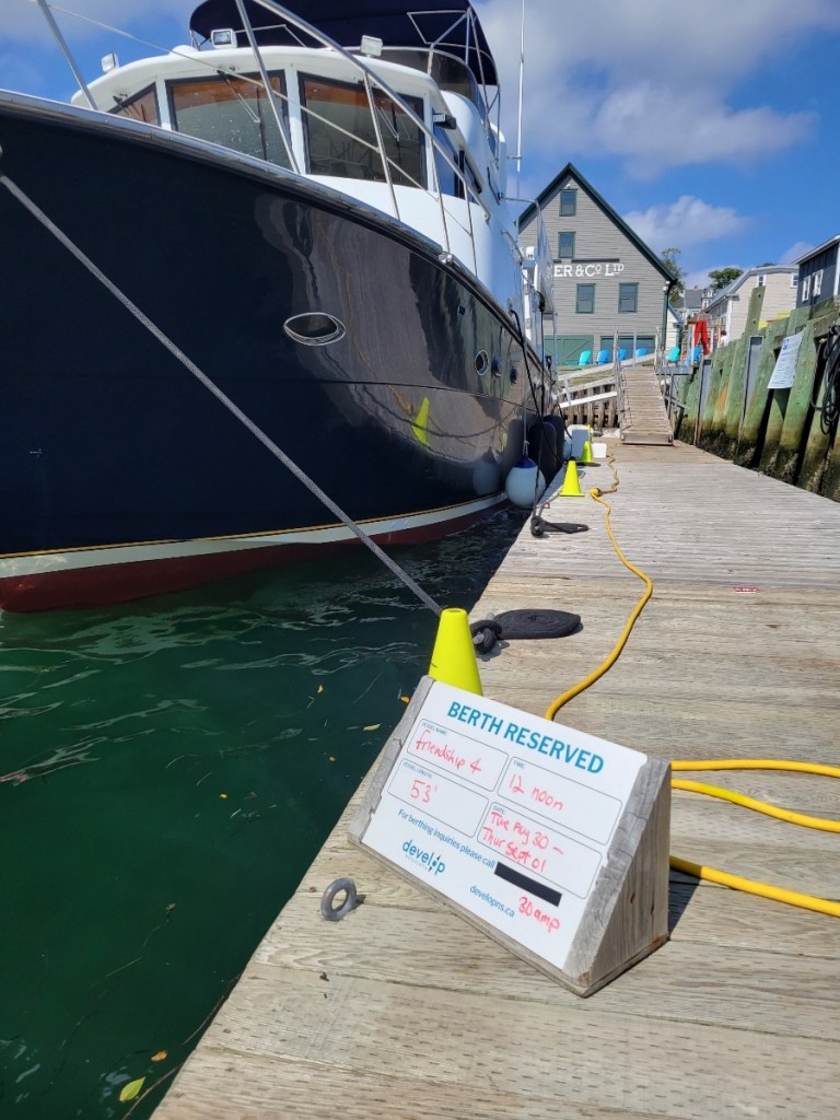 We left Halifax early on Tuesday after dropping Maggie and Charlie back on shore. They were planning to drive down the coat to meet us in Lunenberg. We went down the harbor from Halifax and as we turned in the ocean the boat began to pitch up and down in rough seas. I was sort of wishing I had gone with Charlie and Maggie. Most of the trip to Lunenberg was quite rough and foggy until we got close to the land again. We were in touch with Charlie and Maggie about our entry. Maggie sent us a photo of our spot on the dock. Charlie was on the dock to catch our lines. We pulled in and docked perfectly with Mark’s excellent driving. It has turned into a beautiful sunny day.