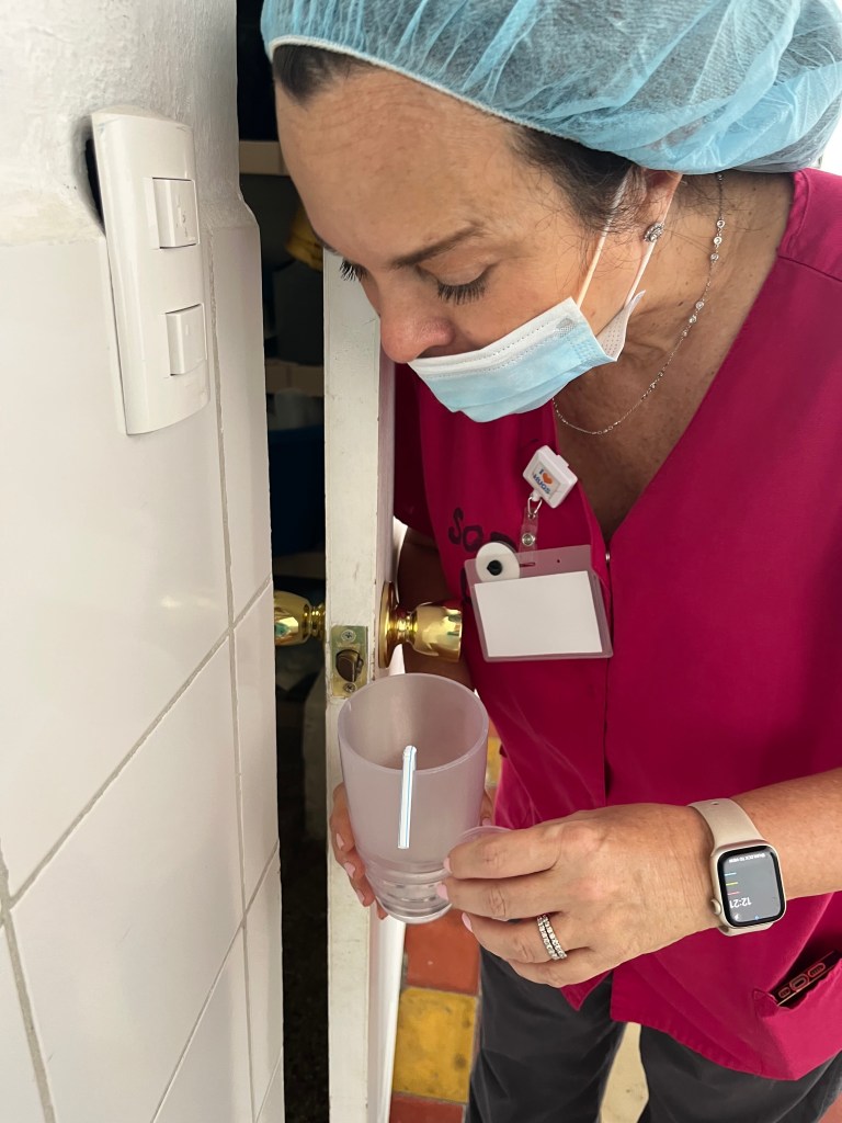 The OR day began smoothly. Around 11:30 one of our anesthesiologists who was doing cases in a room became quite ill with serious GI symptoms. He was unable to continue working. In fact he needed a IV for hydration. Nancy had been giving him a break so she simply stayed in his room. Kim, our administrator, went to talk with the sick doctor about getting an IV for hydration. He agreed once he was able to leave the bathroom.