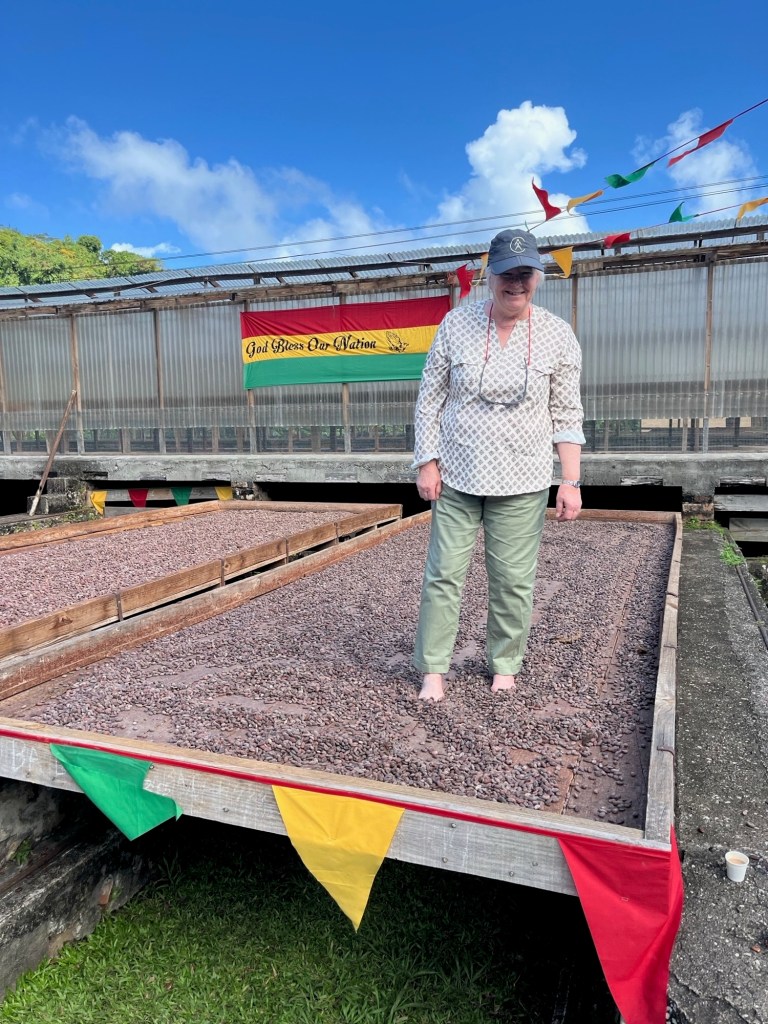 After lunch, we joined the chocolate tour. The facility is quite small. Apparently, their chocolate is sold to various companies to be blended to improve quality. Kathleen had the opportunity to “walk the beans” which is an old process used to help dry and polish them after a week of fermentation. The old method of drying the beans in the sun on trays outside has been replaced by solar greenhouses which are functional even when the usual downpours pass through. We saw the small processing area that turned the nibs that were collected from the cracked open beans into chocolate. Of course they sold chocolate bars.
