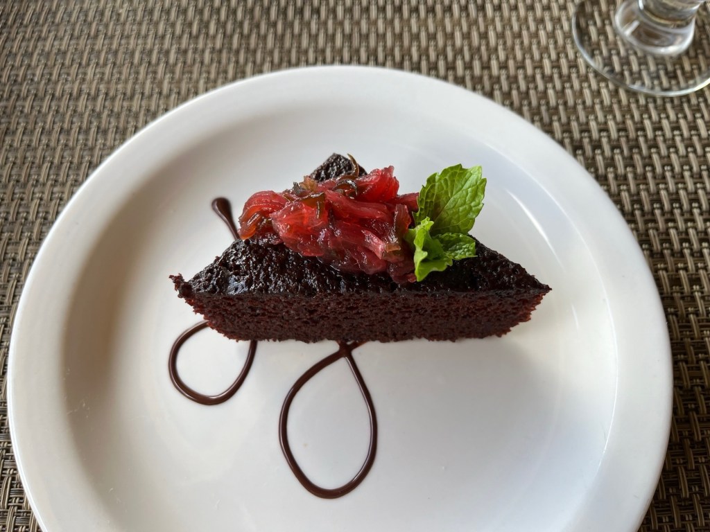Lunch is served in a large open room with extremely polite and well groomed servers. After an appetizer, the meal was a buffet with chicken cooked in cinnamon, banana fish pie, pigeon peas, rice and salads. Desert choices included a chocolate cake which was topped with candied sorrel, a red flower which is used for drinks and sweets.