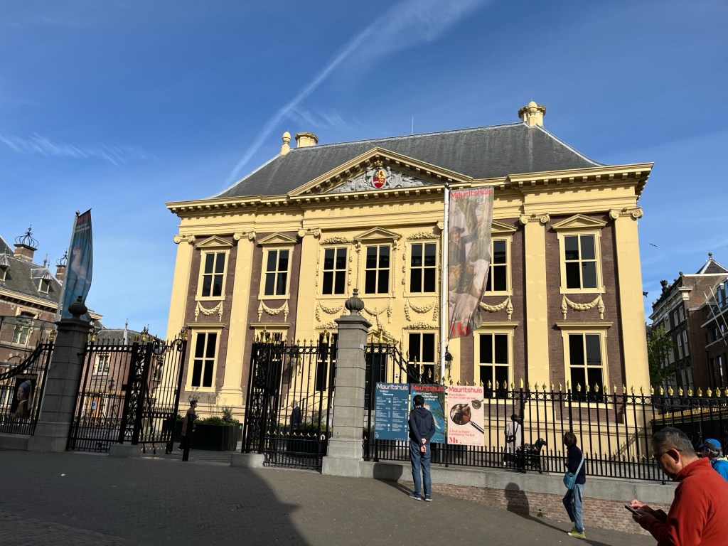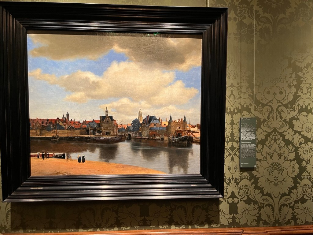 We had bought tickets to the museum for 11am but we were pretty sure they wouldn’t be strict on time. So when we arrived at the museum at 10:15, we went inside and were sent directly to floor 2, room 16. There she was. There was a small railing to keep people at a distance but nothing like the Mona Lisa in a bulletproof box. There was painting on a wall with 2 smaller works, one on either side. She is certainly a mysterious beauty. There were 2 other Vermeers in the same room. Since there are only 36 known works by Vermeer it was an incredible thing to be in a room of 3. The landscape he did, one of 2 known, was every bit as luminous as the girl. Surrounded by paintings of other masters of the same period, it is hard to imagine why other artists painted such flat scenes when Vermeer had such light and perspective. I will need to ask an expert.