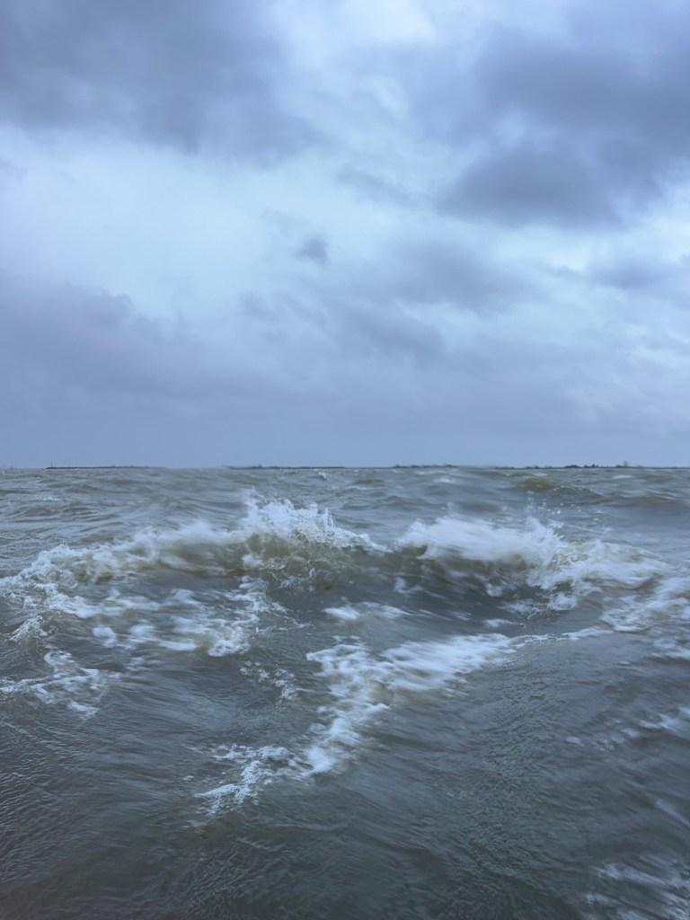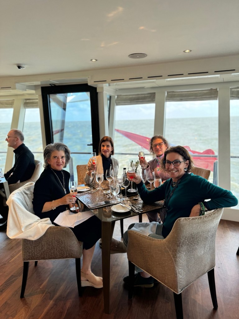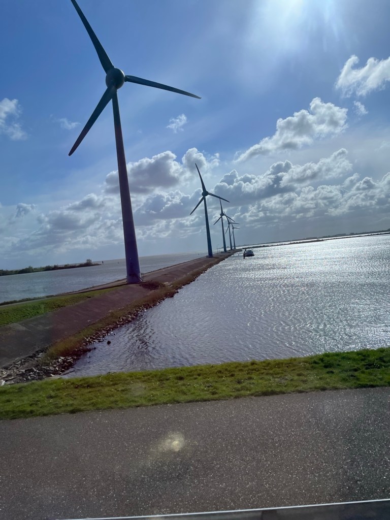 As we traveled to the boat we passed some modern windmills. We will see old ones in a few days. The day was very stormy and windy. The dining area looks out on the harbor. We could see waves splashing against the windows and whitecaps everywhere. The plan to leave port was changed due to high winds. My weather app says 26 knots out of the northeast. The captain said that our planned trip would have been very rocky. It’s not good to have passengers who are seasick on day 1.