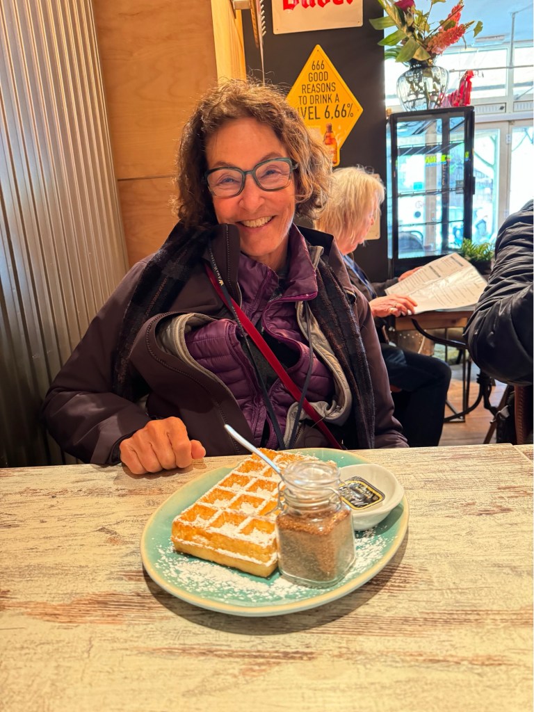 We walked toward the church that houses the famous Ghent altarpiece, the adoration of the mystic lamb. The church was free to enter and quite impressive. The altarpiece required payment and a line. I needed to get warm and try a Belgian waffle too. My friends agreed that we should find a warm spot to eat a bit and stay out of the cold wind. My waffle was excellent, served with butter and brown sugar. I added a coffee with Baileys to warm my hands along with my insides. Many of our bus group seemed to have had the same idea. We met our guide again, hopped on the bus, and returned to Antwerp.