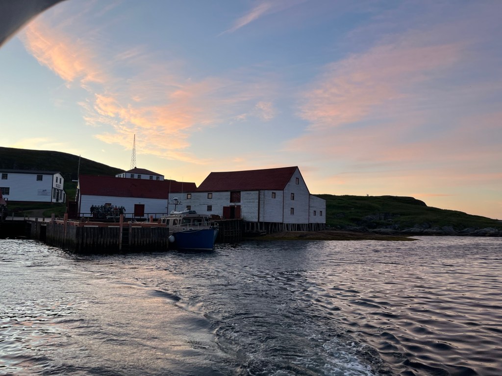As we approached the tip of land that begins the Newfoundland coast, we had a display by numerous whales spouting nearby and in the distance. Then the dolphins appeared just after the whales dove down out of sight. The sea was dead calm so the display was easy to see. Max also narrated stories of the islands and pointed out a shipwreck. Great entertainment for a long day at sea.