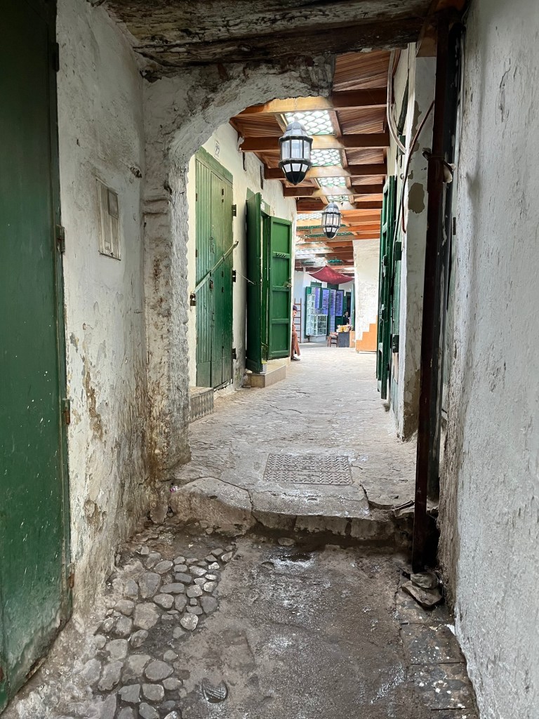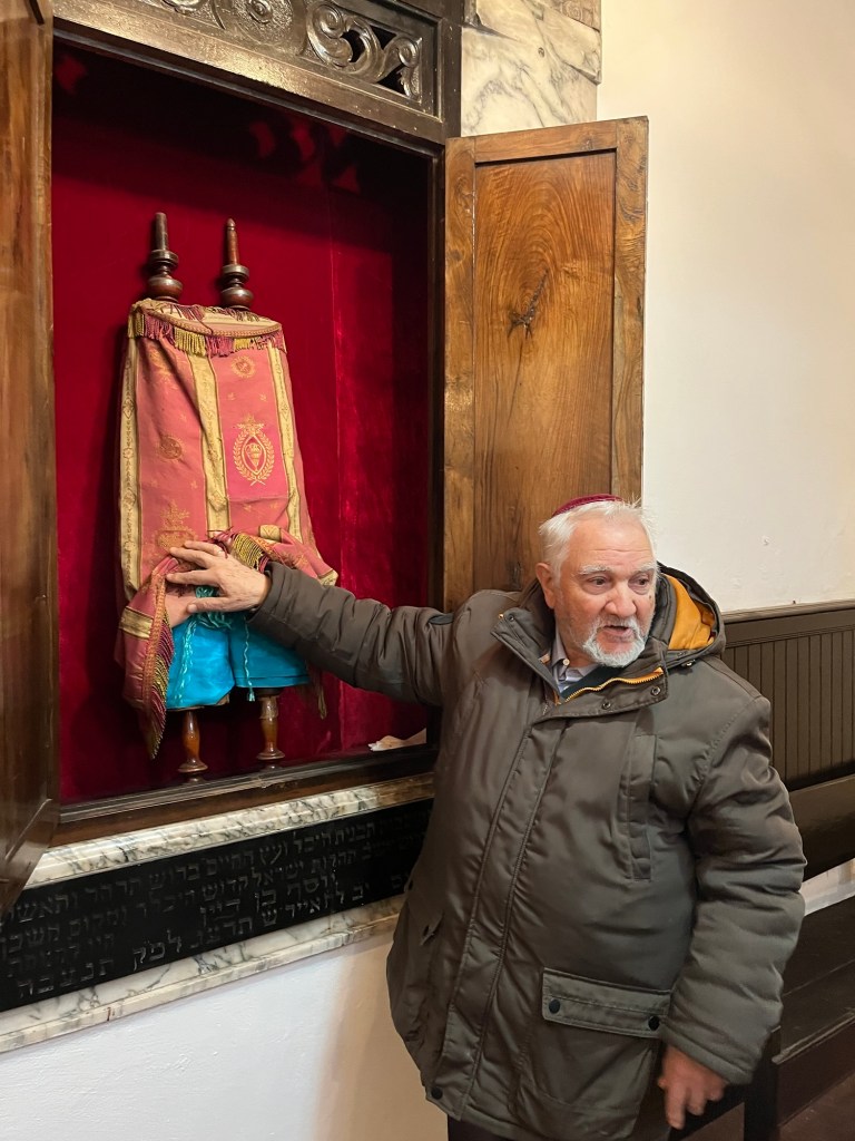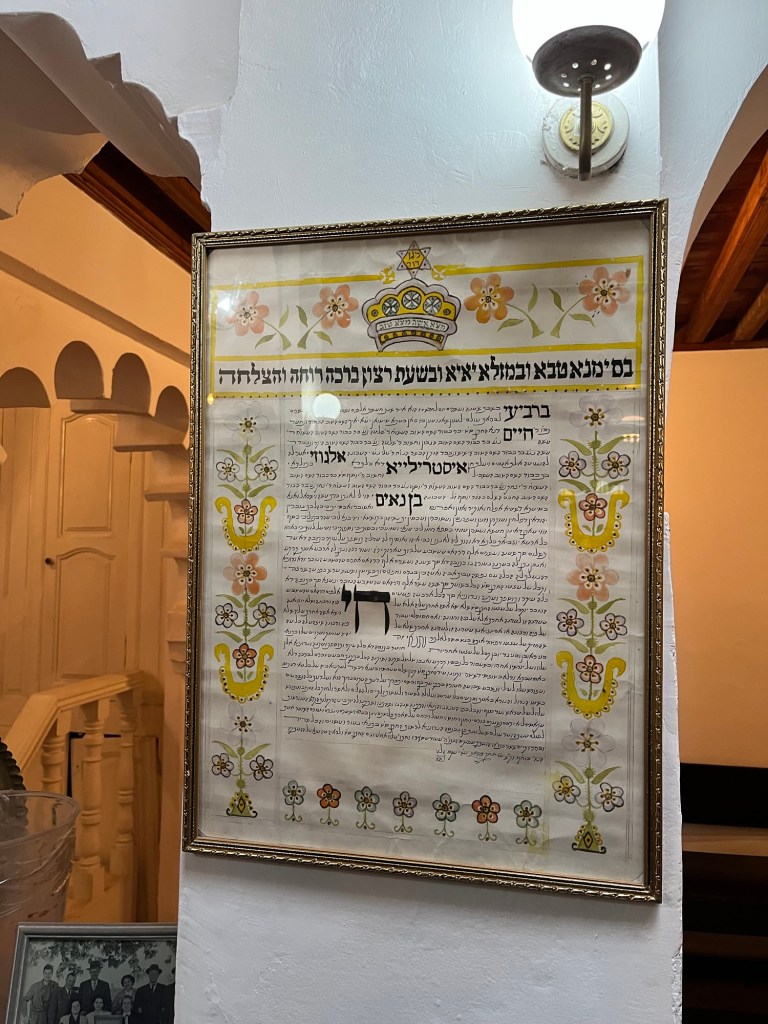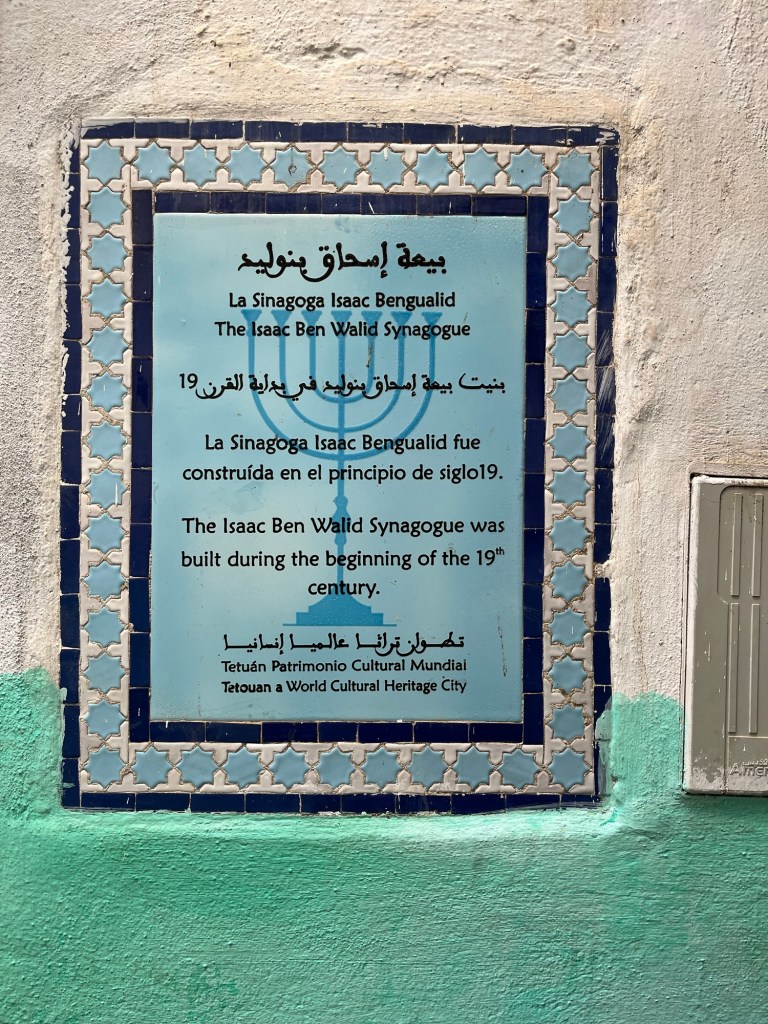 Then we walked through the medina – the old city within the city wall with narrow streets and small homes and shops. We stopped at several shops that caught our interest. One was a bakery where we all had some pastries we had not seen before. Another was a carpentry shop where a craftsman and his workers were building custom wooden furniture that had a lot of inlays and hand carvings. I was particularly interested in this being a woodworker. We also stopped in an area where men were sewing garments with only had stitching. They said it took them 4 days to do one garment. If you wanted to order one, you had to visit 3 vendors. First you purchased the fabric from one vendor. Then you got measured by another vendor. Finally you gave the measurements and fabric to one of these vendors who will make the garment. The last stop in the medina was a synagogue. The keeper gave us a great orientation tour.