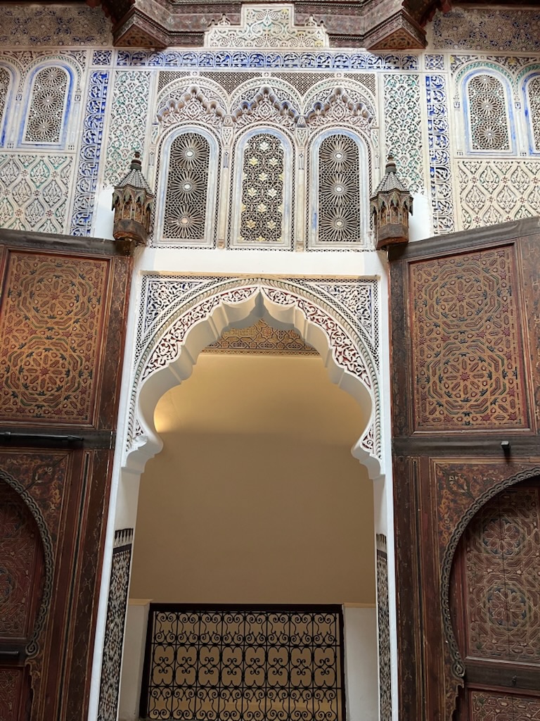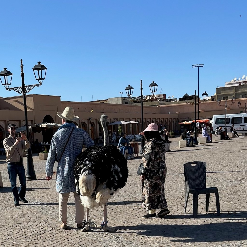 We had a short ride into the old town where we began our walk into the Medina. Since it is Friday, all shops are closed because everyone goes to the mosque at noon for prayers and then spends the afternoon sharing a meal of couscous. The street walls were beautifully decorated. We visited the museum of music. It had many different instruments that are typically used in Morocco. But the most interesting part was the walls and ceilings of the rooms. They were richly decorated like our Riad with mosaics, carved plaster and painted cedar ceilings. As we left the museum, we crossed a large square just outside the Royal palace walls. There were a few monkeys, an ostrich and pony cart all available for photos or a cart ride.