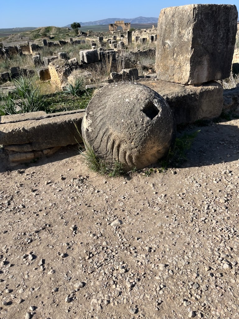 The were several gates for entry to the city and a triumphal gate at the end of a carriage road. Our guide talked about the history of Rome and its spread to Africa. Volubilis was a good site for crops with plenty of water. The hills surrounding it supplied limestone for building. It was on a plateau that gave the inhabitants visibility of invaders. It was the southernmost border of the Roman empire. Apparently Fes became important soon after Volubilis was abandoned so the city degraded in weather and time but it was not replaced.