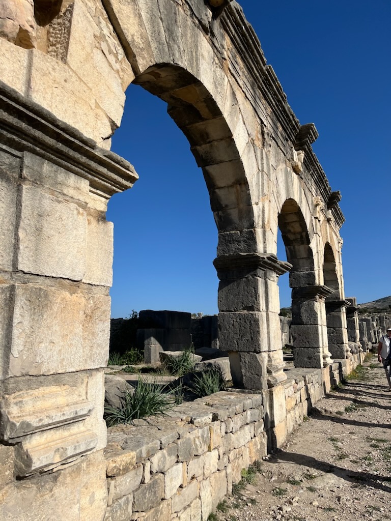 We reached Volubilis to see an enormous (104 acre) old Roman city that existed from 40-300 AD. Our guide gave us many facts about what is known from the site. Important houses had a fountain, basin, garden and columns. The entrance was through 2 guarded doors with an offset so that it was not possible to see inside. There were no windows or openings on the outside walls. All light came from an open central courtyard.