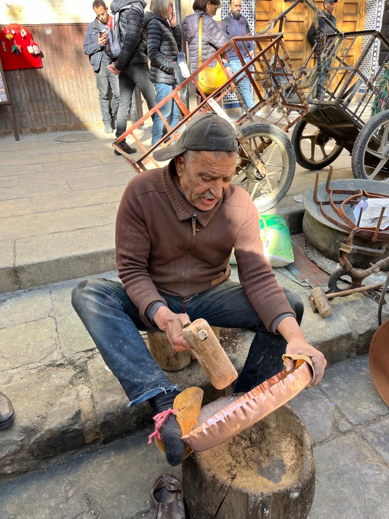 The Fes Medina inhabited since the 9th century, is the largest car free area in the world. Well the streets are so narrow that cars would never fit anyway. It is said that there are 9000 alleys. We made sure we stayed close so as not to get lost. Our guide grew up here so he claimed to know all the streets. It is a place filled with shops of every kind, a university and a madrasa. Saturday is a big shopping day. The Medina is alive with people. In addition to shoppers there were the usual people following us to sell their wares and occasional beggars.
