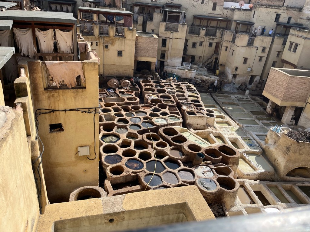 We walked back into the shopping area where we stopped to visit the wood carvers. Then we visited a tannery. We were given mint sprigs to hold under our noses when we climbed to the roof to look down on the tannery vats. They first use pigeon poop to treat the leather. Urine was originally used but apparently it was considered dangerous. The treated skins are rinsed and dried then dyed with natural dyes including saffron, mint, kohl, henna. We were then set free to shop in their store. Of course many of us bought beautiful things.