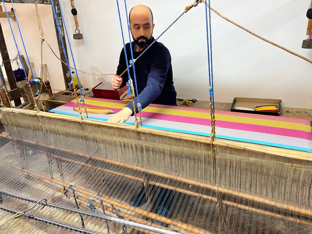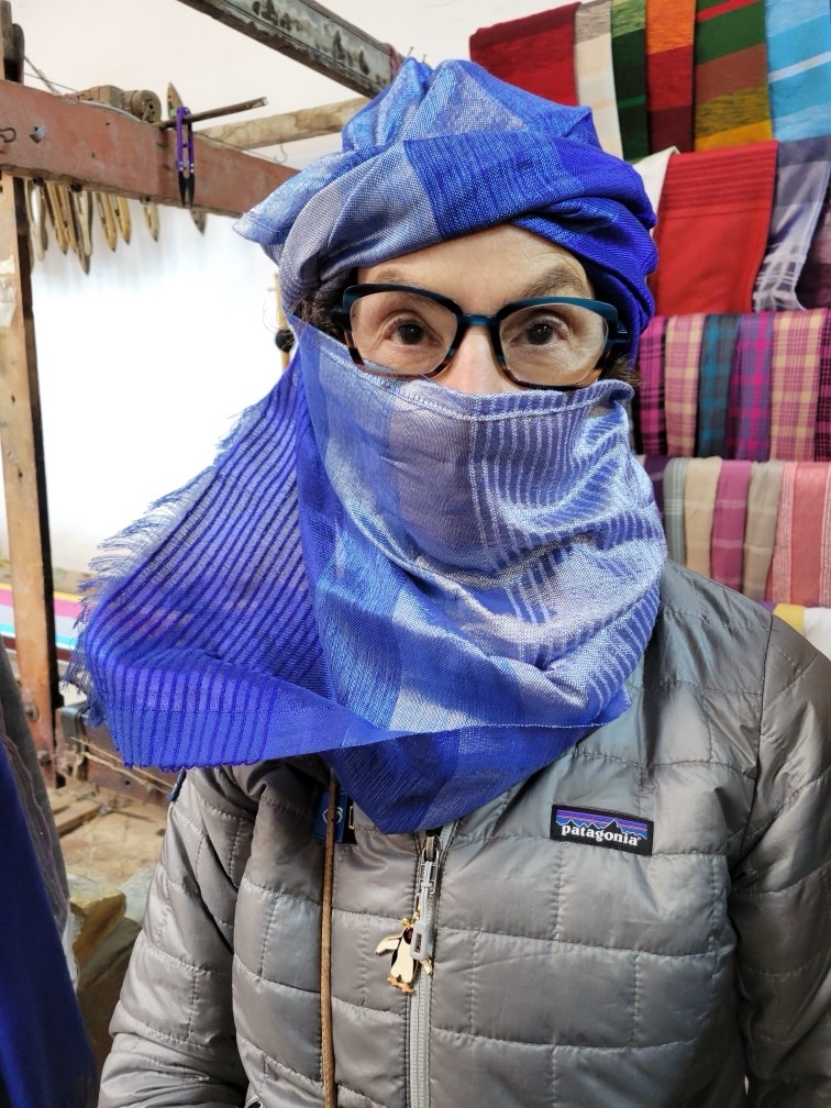 Our last stop was a weaving shop that is now in its fourth generation of owner/weavers. After a demonstration of the process on a big hand and foot operated loom, the weaver showed us some products. Many are made from silk from the agave plant, not silkworms. The fabric is beautifully colored and scarves are very useful since we will be in the desert where there can be blowing sand. We learned how to tie an Arab scarf to use for head and face covering. Then many of us bought the scarves.