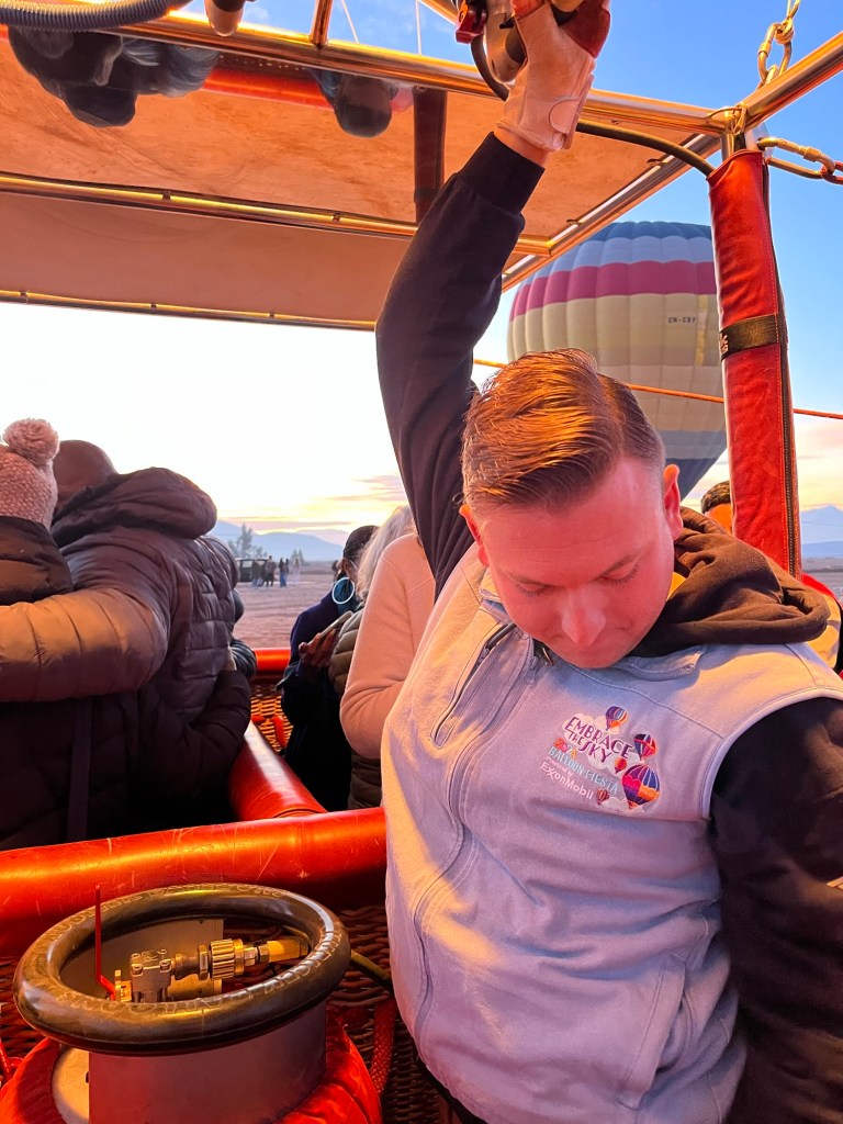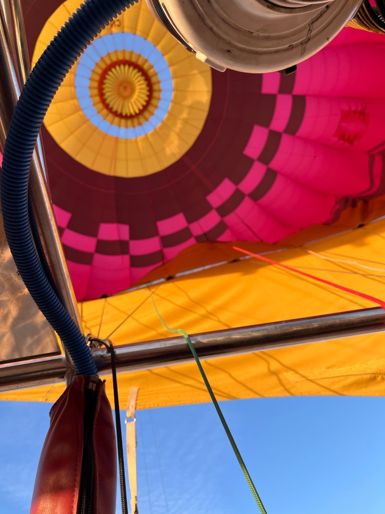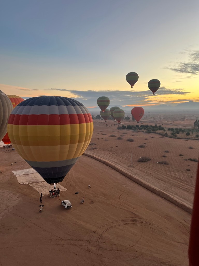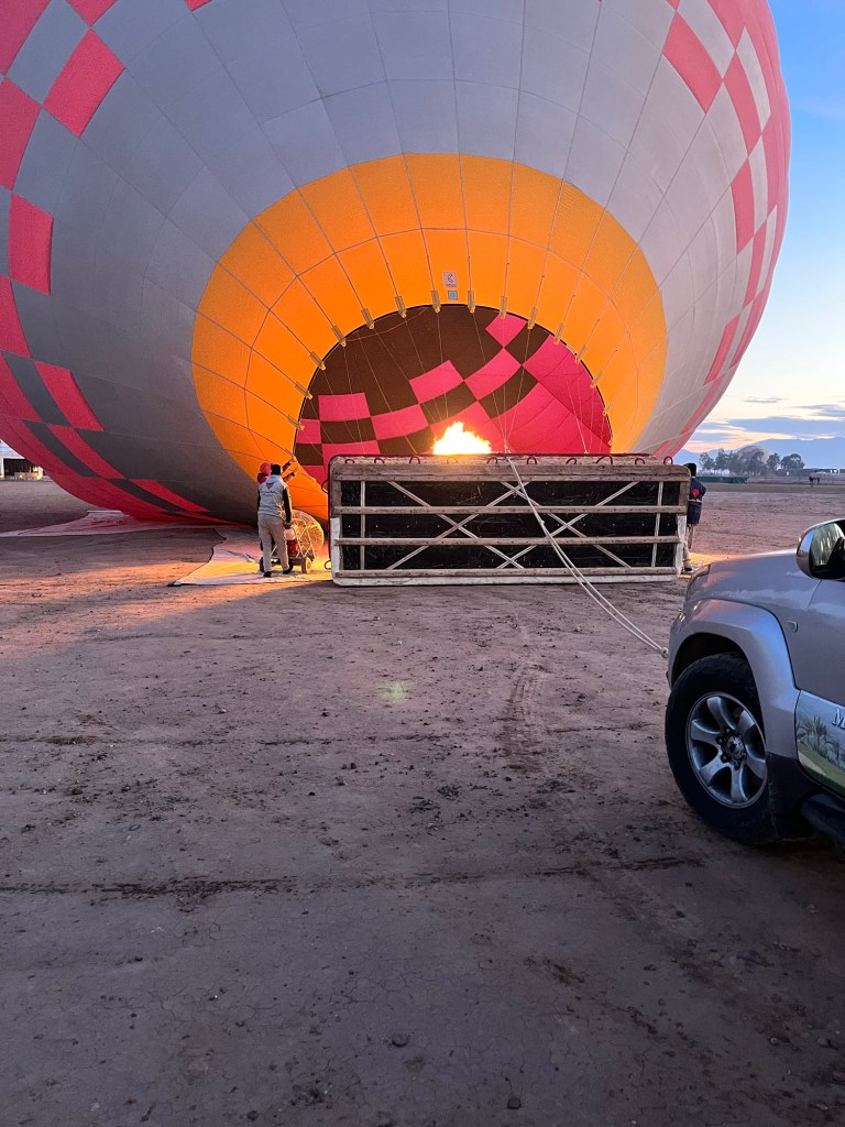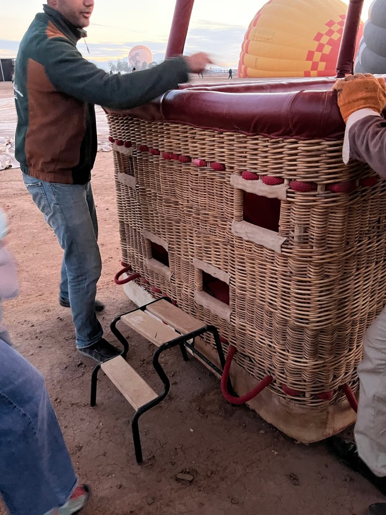 I signed up for a sunrise balloon trip that would take us up over the desert and looking at the mountains. We were supposed to be ready to go from the hotel at 6:15. I had set my alarm for 5:45, or so I thought. I heard some faint knocking at my door and looked at my phone. It was 6:26!!! Luckily I had slept partially clothed and was able to grab the rest of my clothes, get dressed and run downstairs to find the lobby empty. I called Abdou to tell him I was there. He asked if I could come out to the square. I ran back to my room to grab my glasses and ran out to the square. We hopped in a taxi and took off in the dark empty street. We stopped behind a van where Abdou told me I should get out of the taxi and into the van. As I stepped into the van, I looked back to see no familiar faces. I said good morning and heard a little reply from the back that let me know my group was there. We continued on air about 20 minutes until we arrived at the balloon launch site. There were campfires, blankets, tea and coffee available. My friends were relieved to see me. I looked at my phone to see what had happened. I had set the alarm for 6:45. Ugh. But Abdou had done his best to get me there. Amazing and so appreciated.
