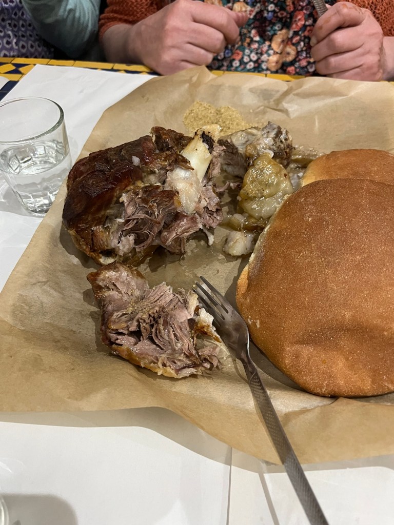 We moved on to lunch in the edge of the Medina. It was a clay roasted chunk of lamb served with salt and cumin. It is to be eaten with fingers. Very delicious!