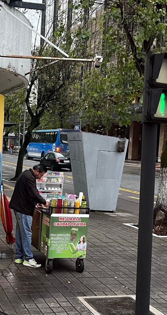 As we turned the corner from our hotel there was a man selling fruit drinks. He’s there every morning. I guess it’s a good spot. It was foggy this morning but still possible to see the surrounding hills packed with houses. Quito is on a plateau on the edge of an old extinct volcano so the city is surrounded by hills. In many South American cities including Quito, the poor people live up high in the hills and the rich live in the valleys. It’s not like that at home.