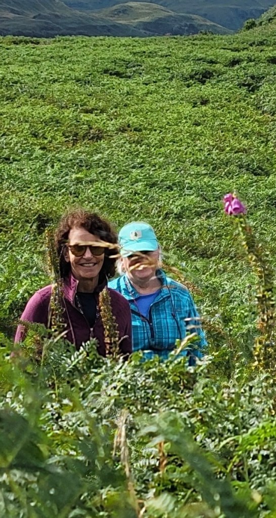 We decided to take a different route back down. We were eventually bushwhacking through very tall sturdy fens. Dale and I were a bit slower than the rest because we were taking photos and admiring the view. We lost sight of Kathleen and Doug. Dale was able to call Doug to be told to turn back because the path was very slippery and dangerous. As we began to climb up, we were able to just discreet hats in the tall ferns below. Our rerun down the original path was easy.