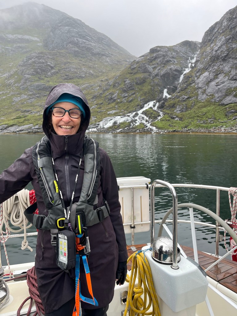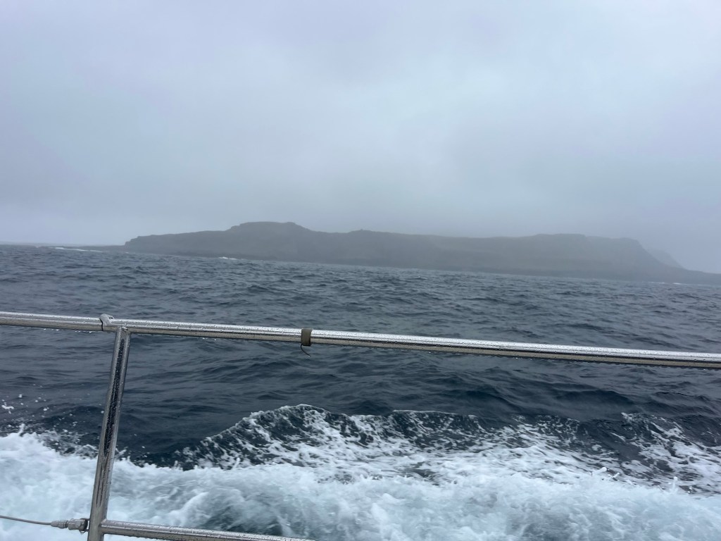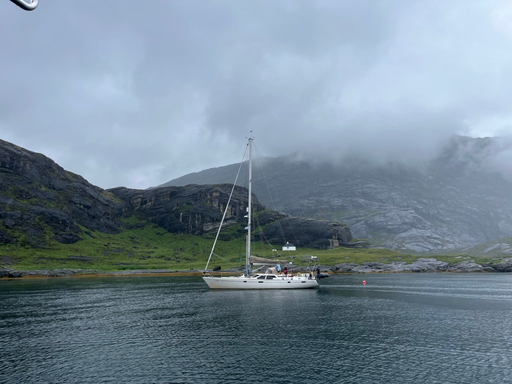 It was rainy, chilly and grey for most of the day. But we had very good wind except for one point when we were between 2 islands when the wind was blanketed by hills. We were well ahead of other boats going in the same direction. So we decided to go to Loch Scavaig which has a small 4 boat anchorage surrounded by cliffs and waterfalls. It is a very scenic and serene spot.