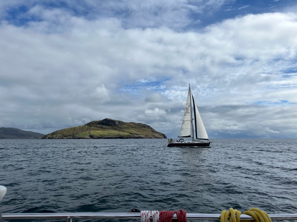The fleet left Vatersay this morning. Sadly, one boat had been pushed up on the rocks in a nearby harbor during storm early Sunday morning. They had no hull damage but lost their rudder. So they had made it to Vatersay for the party but had difficulty steering. They were towed out of the harbor this morning as their rudder fell off. Apparently they were all able to join other boats on the cruise.