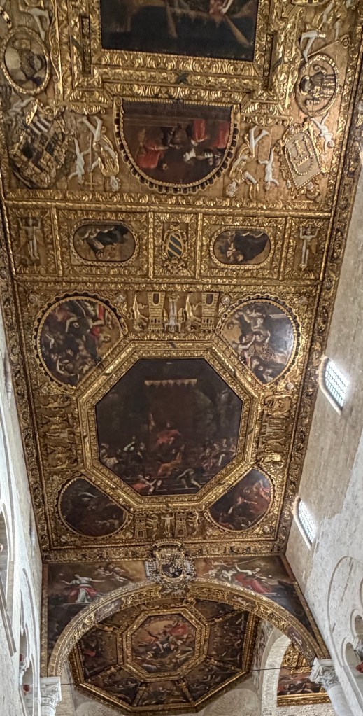 We bought tickets from an automated machine and returned to our hotel to pack our bags. We left our luggage at the hotel while we visited a few more sites in Bari. The day was beautifully sunny. We walked to the Basilica di Saint Nicola located in the old town. It’s a beautiful ancient church with painted ceilings. Then we wandered along the waterfront to visit a museum that had a strange mix of old and new.