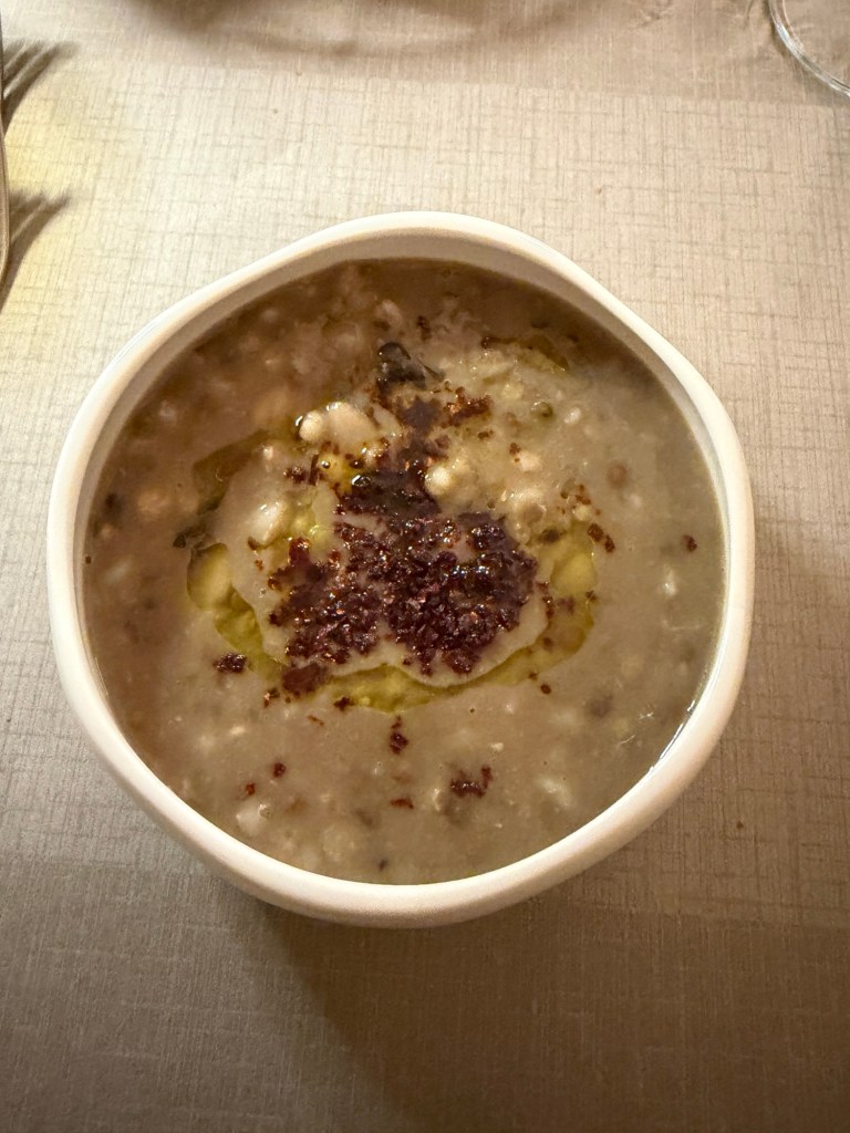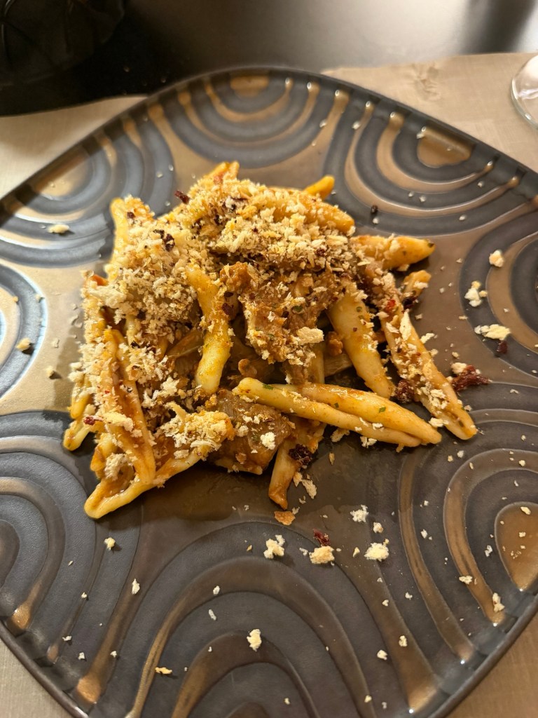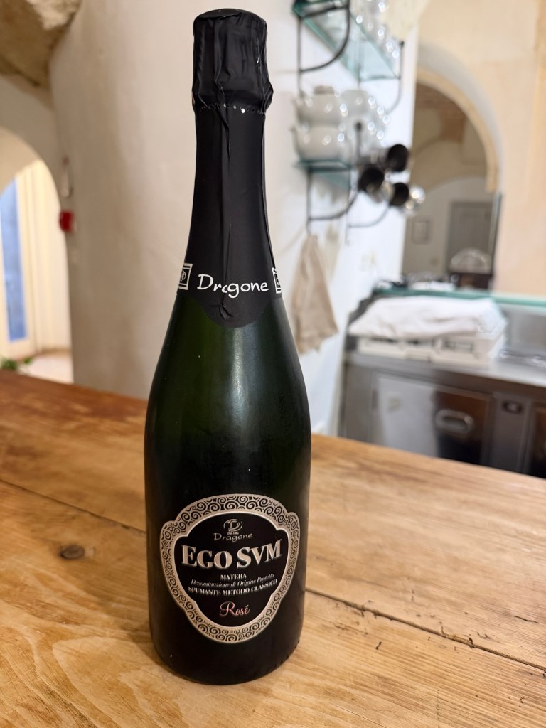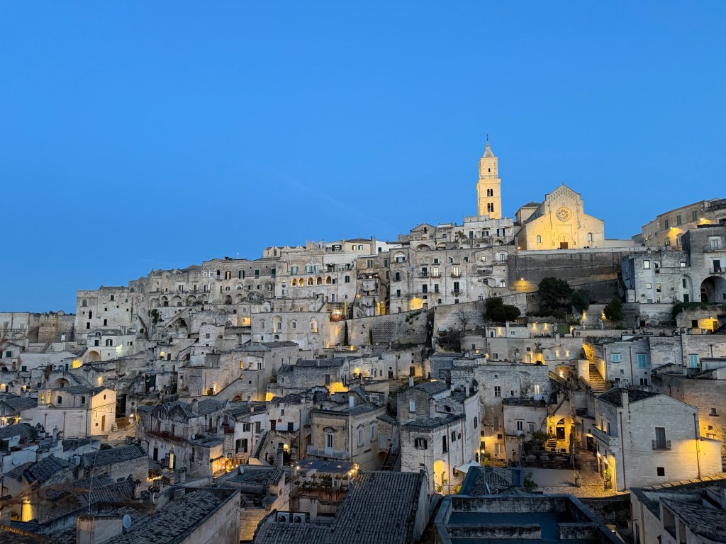 We were met at the gate by a young man who easily took our bags down the narrow stairs to reception and then to our very unique rooms. Hotel Sassi, like much of the area is a place carved in limestone. It’s amazing. We checked into our rooms. Then we were told about the beautiful blue hour approaching darkness. It gave us a fantastic view of the town. We drank a local prosecco before dinner then we ventured downstairs to the street below for a delicious dinner of local specialties. After much wine, we made our way back to our hotel to finish another wonderful day. Tomorrow we explore on our own.