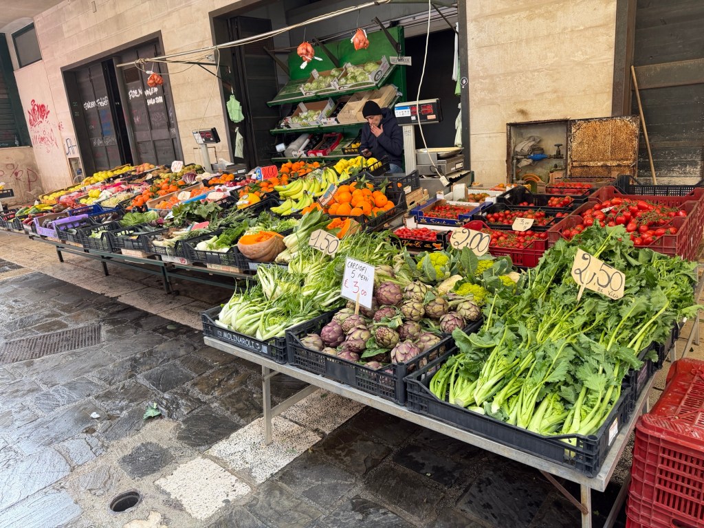 As we came back towards our hotel, we stopped for a shared sandwich of prosciutto, tomato and arugula on nicely warmed thin bread accompanied by local wine, Primitivo. We are learning our way around the town.