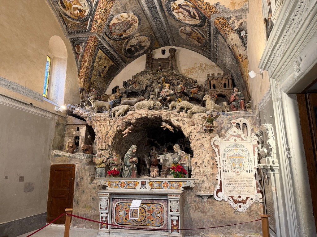 It’s a bit challenging to wander the old town streets because the street names in buildings are either absent or very hard to read due to aged paint. We crossed through the main square and visited some very fancy food shops before heading for the cathedral. We passed some spots with beautiful views facing into our part of the old town. When we reached the cathedral, we paid an entrance fee to visit their collection of reliquaries and paintings which then led to the cathedral. There were a few areas of floor covered by thick glass that revealed an older church and burial sites. So much of Europe is ancient. They are always finding old ruins as they excavate.