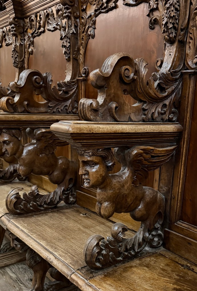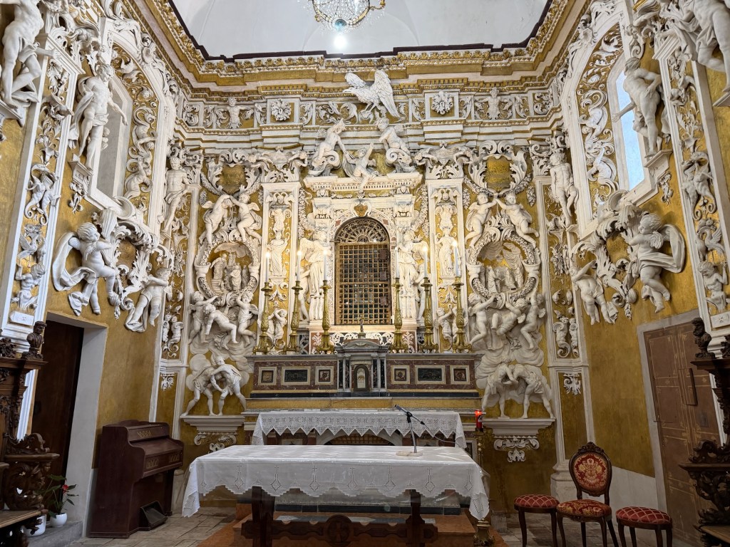 We visited the church seeing the private family chapel first. The wall figures are all made of plaster with a special treatment that makes appear like marble. In addition to the usual angels, there were panels showing mean and unhappy people being tortured as a warning to behave. The chapel held the skull of Mary’s mother behind the altar in a locked cage which is paraded around town once yearly. Other rooms held silver and gold items that were part of the religious items of the church. My personal favorite is the ones that supposedly contain bones of saints or pieces of the cross.