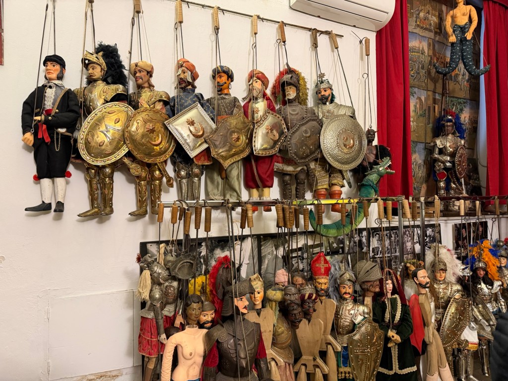 Puppets take about 25 days to make. The family was involved with men carving the wood and women making the clothing. The puppeteers stood off to the side of the small stage telling the story and using their feet for sound effects.There are at least 300 different shows that are done. There are 2 puppet theatres in Sicily. The other is in Catania where we will go at the end of our trip. The theater we visited survived because they made their own puppets. Otherwise, buying a puppet costs about 1,000 euros.