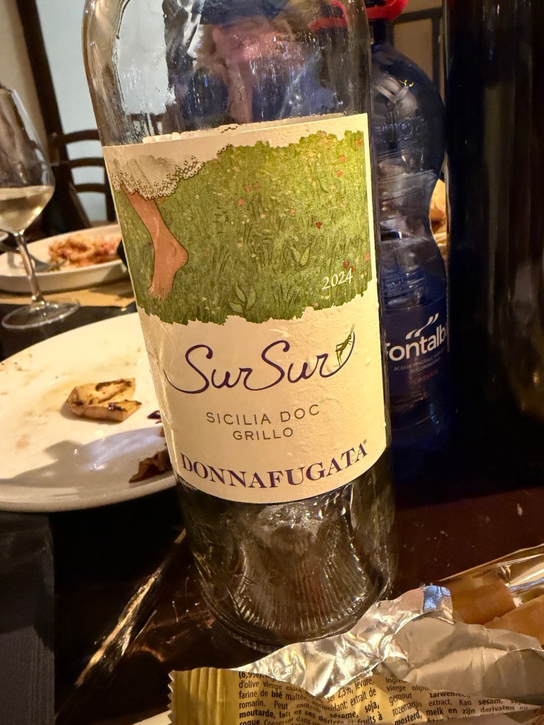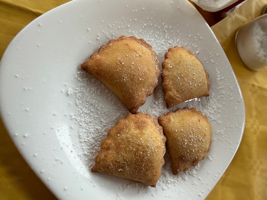 We had a delicious lunch with many small plates including olives with oregano, zucchini shredded and marinated with white vinegar, lemon, garlic, olive oil, salt and a touch of cinnamon. There were small arancini (rice balls) filled with a cooked green vegetable; cheese slices with pistachio bits and then thinly sliced roasted pork. Dessert was fried ravioli filled with goat milk ricotta and tiny chocolate chips. It poured rain almost the whole time we were eating so that our hike after lunch had to be canceled. So…we drank another glass of local wine before returning to our bus to travel to Marsala.