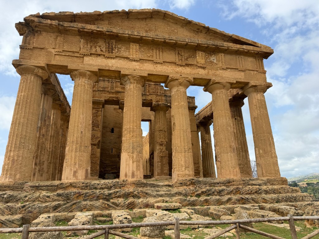 We drove a short way to reach Agrigento. The new city is visible on the hillside beyond the archeological park. We were met by a local guide, Alice, who is an archeologist. She was full of enthusiasm and information. We visited several temples that have survived in various states of repair. The main temple of Concordia built in 440-430BC is the finest example of a temple outside of Greece. It survived apparently because it was used as a church in the 17th century. Original city walls and other structures’ stones were used for building other buildings as the area was conquered. Luckily the rain had stopped and we had a sunny but windy day along the coast.