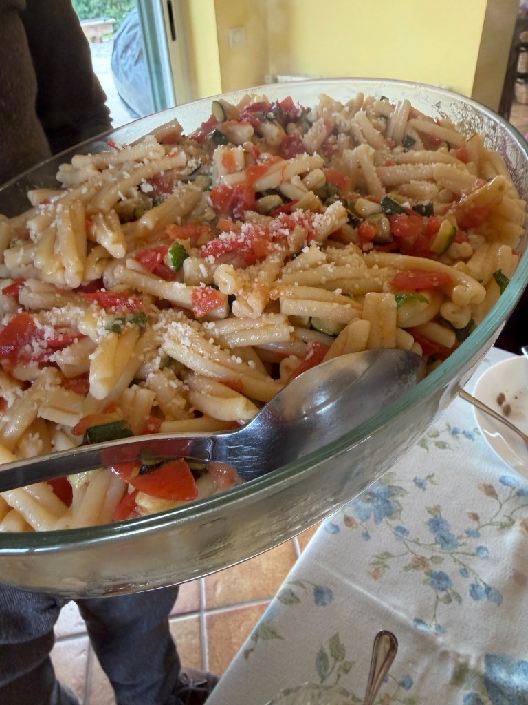 We left the temples to have lunch at a private home. Our hosts Rita and Marcelo were proud to explain that nearly everything we ate was either home grown or locally made. We began with olives, cheese, bruschetta, sun dried tomatoes, bread and lettuce with home made olive oil and vinegar. The main course was pasta with chopped tomatoes, chopped zucchini, basil and mint. We were watched by a group of cats outside clearly waiting to be fed. Dessert was fresh fruit with lemon sorbet and a red wine sauce drizzle. When we asked how often this couple served lunch, they replied about 220 times per year!!