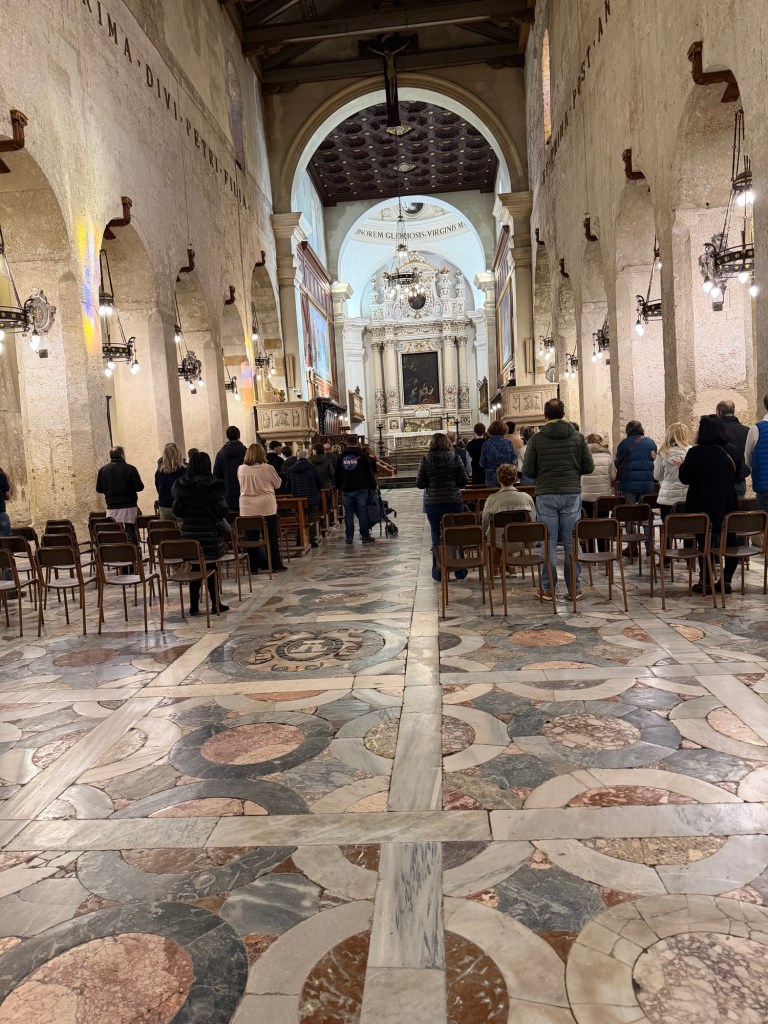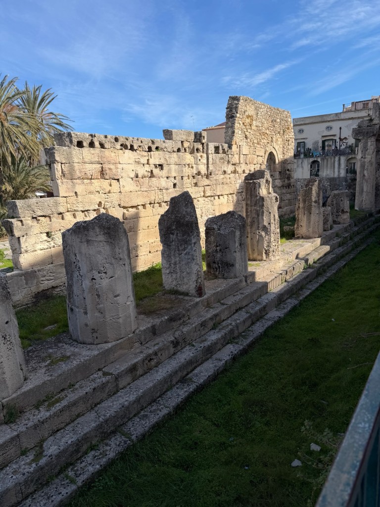 We left Ragusa heading for Siracusa. We drove through beautiful green fields filled with lemon trees and olive trees. We reached the parking lot on the edge of town. Archimedes lived in Siracusa. His statue greeted us as we entered town. We met our local guide who explained that Siracusa was a major point of the Allied invasion in WW II. Much of the town was destroyed but certain important areas were left untouched. We walked to the temple of Apollo, the oldest Greek temple built in the 6th century BC. Ortiga, part of Siracusa, is a small island reached by a few bridges. There is a blend of Greek and Roman ruins visible in many areas. The island has a blend of many religions visible in designs on houses. We visited a baroque church in the center of town. Then we took advantage of the beautiful sunny day and sat at a restaurant in the main square.