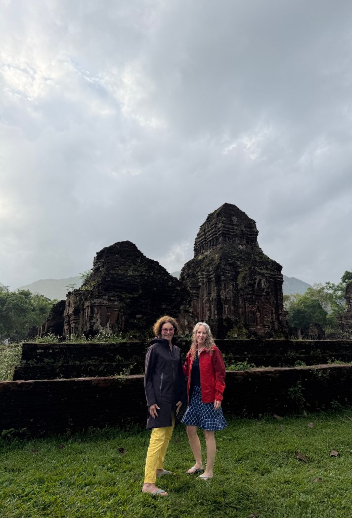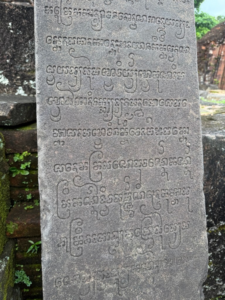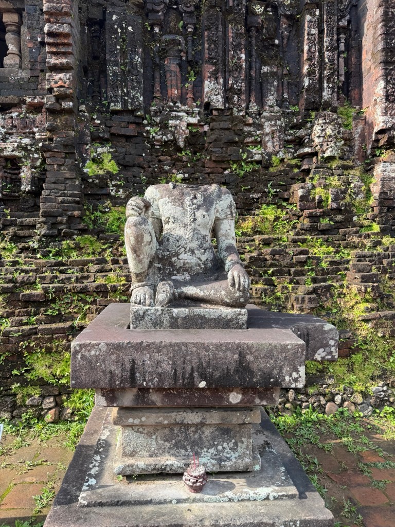 Our destination was a UNESCO site “MY SON”. It means beautiful mountain. It was built over 10 centuries from the 4th to the 13th as a tribute to the Hindu god, Shiva. During this period the area was home to the Cham clan. Their language and writing visible on some structures is totally different from Vietnamese. The Cham were displaced by the north Vietnamese in their push to expand territory. The area had been abandoned until it was rediscovered in the early 20th century by the French. It was reclaimed from the jungle. Several wars have added to the destruction. Bomb craters around the grounds and bullet marks in the buildings are evidence of war destruction.
