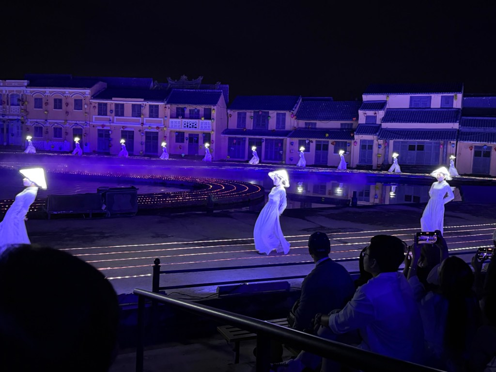 We sat outside in the shade and had a snack while enjoying the ocean view. We regrouped later to go into town for dinner and the Hoi An memories show. The show is on an island that is very much a theme part with many shops selling food and show related items. There was a street performance before the show with dancers and acrobatics. It felt very Disney-like.